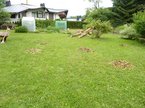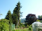 Übrig geblieben sind nur noch die beiden Baumstumpfe und eine Menge Arbeit. Das Holz muss kleingesegt werden, die Äste gehäckselt und die Wurzeln entfernt werden. Aber der Gemüsegarten hat nun mehr Sonnenschein und die Wurzel entziehem ihm auch nicht mehr die ganzen Mineralstoffe aus dem Boden.