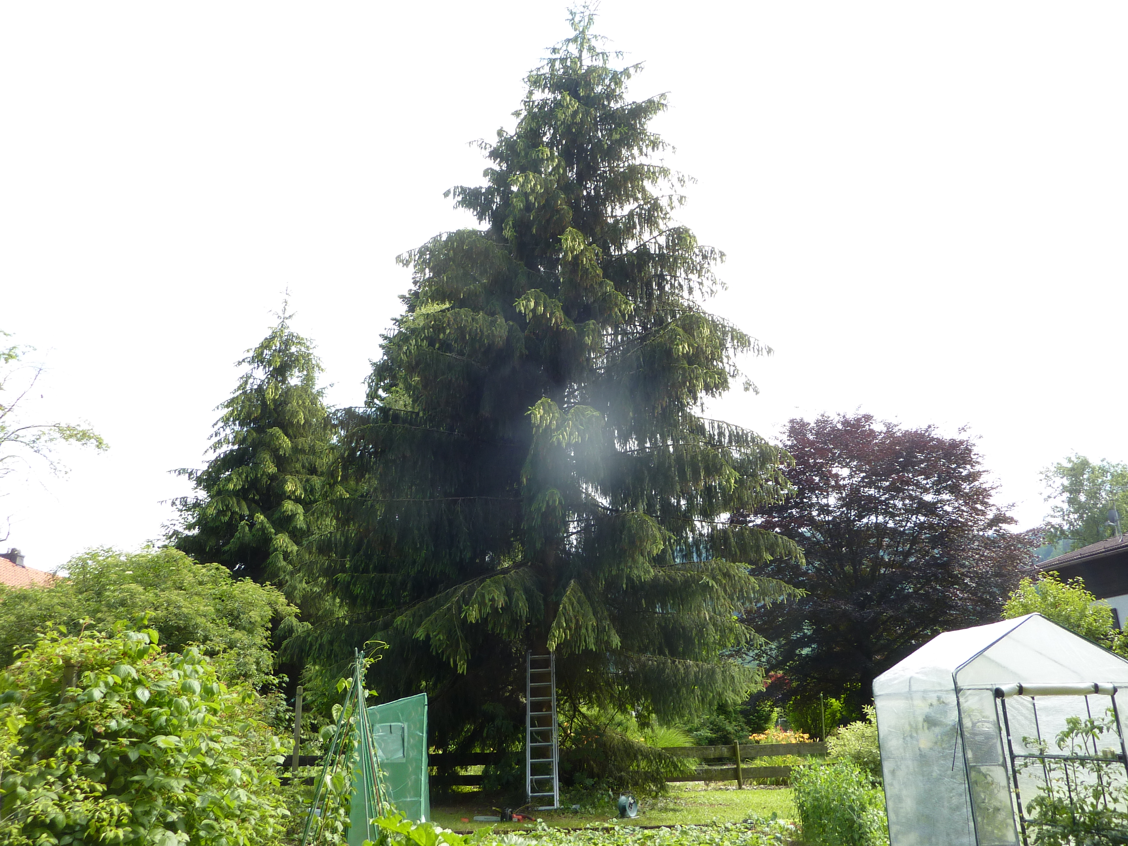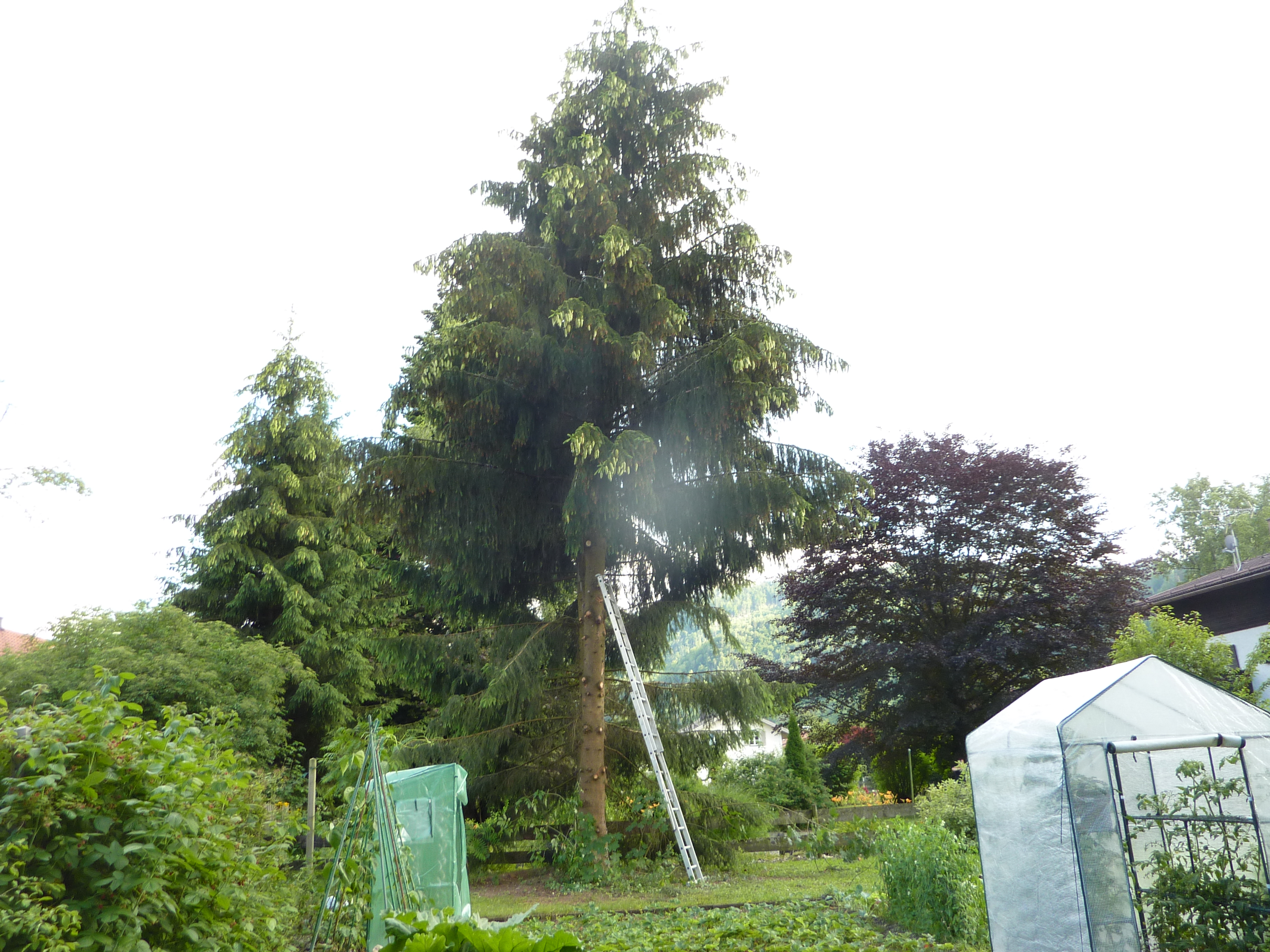 Nun ist es an der zweiten Fichte ihre unteren Äste zu verlieren, damit die Rose nicht noch ein zweites Mal in Mitleidenschaft gezogen wird.